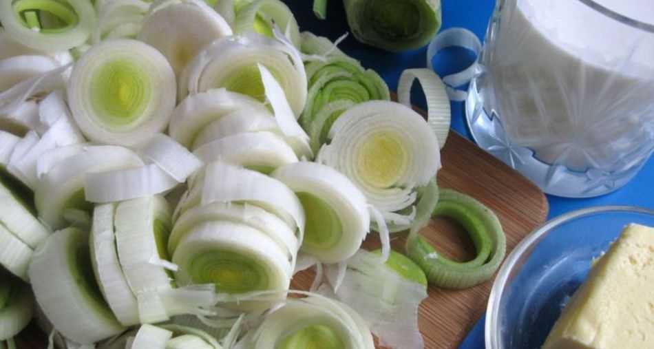 - По рецепту, используем только белые части лука порея, которые мелко (по желанию) нарезаем.