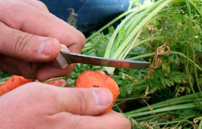 У собранной морковки срезают надземную часть, оставляя хвостик длиной не более 2 см. Ботву срезают как можно быстрее после уборки – в первые два часа, иначе зеленая фитомасса вытягивает влагу из корня.