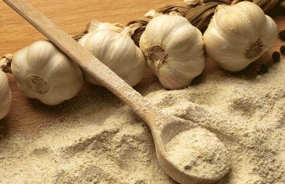 Также чеснок может храниться в виде порошка. Для этого зубчики режутся пластинками и высушиваются, после чего перетираются в ступке, смешиваются с солью и укладываются в плотно завинчивающиеся банки.