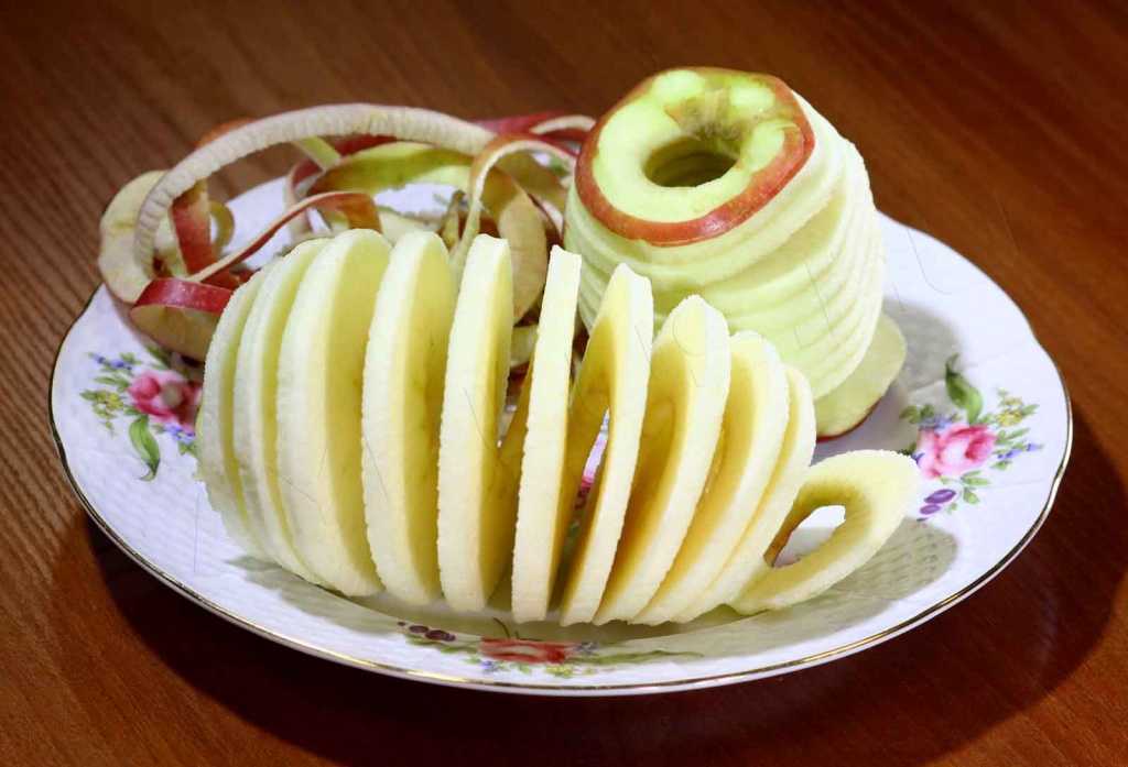 Первый способ заключается в том, что яблоко необходимо держать в одной руке, а другой нарезать его небольшими дольками средней толщины до тех пор, пока не останется одна сердцевина. Если вы привыкли работать на разделочной доске, то воспользуйтесь этим приспособлением.