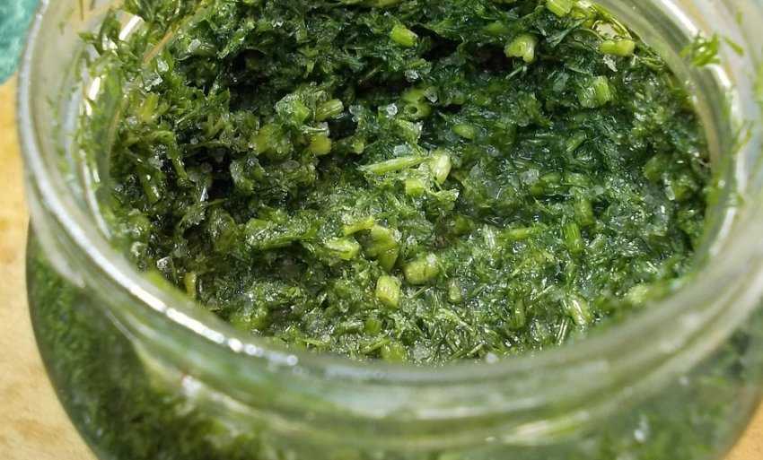 - классическим рецептом заготовки с солью сухим способом (без добавления воды) считается соотношение 4 к 1, то есть на 4 части зелени берут 1 часть соли;