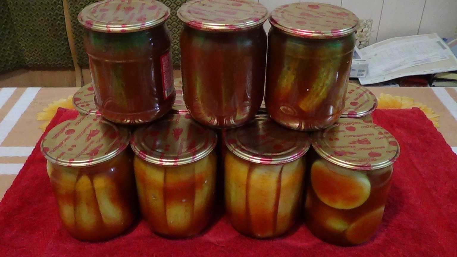 Консервированные огурцы с кетчупом Чили готовы, можно их перевернуть, накрыть плотной тканью на сутки, а затем убрать к остальным зимним заготовкам.