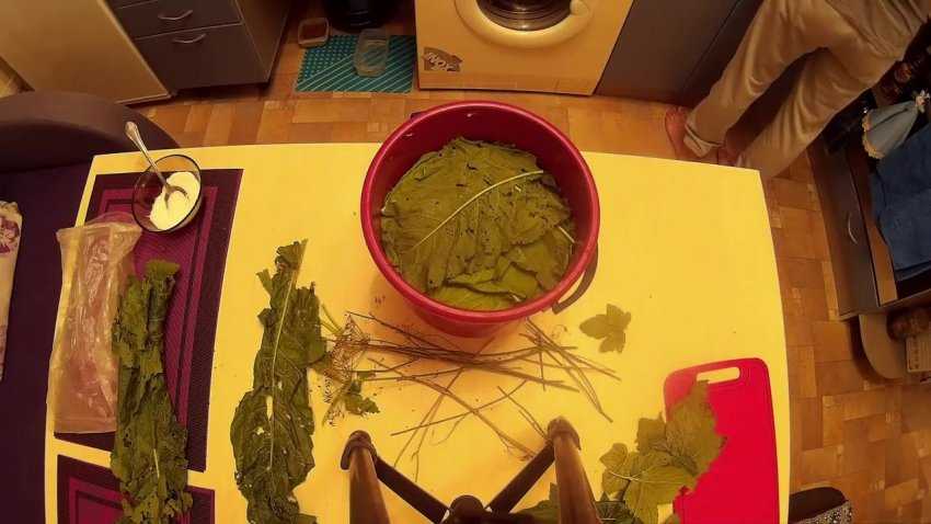 На дно необходимо выложить листья хрена и смородины, чесночные дольки и слой соли, а также головки укропа.