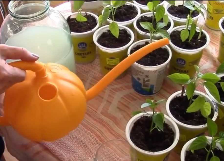Первый раз удобрения вносят после появления двух настоящих листочков. Делают это для роста рассады перцев и укрепления её корневой системы.