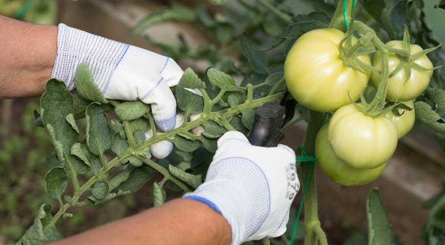 Пасынкование проводят по мере отрастания пасынков, а параллельно с этим, обламывают один — два листа ниже плодовой кисти. Большое количество листьев приводит к нерациональному расходованию питательных веществ, создает затенение, ухудшает созревание плодов.