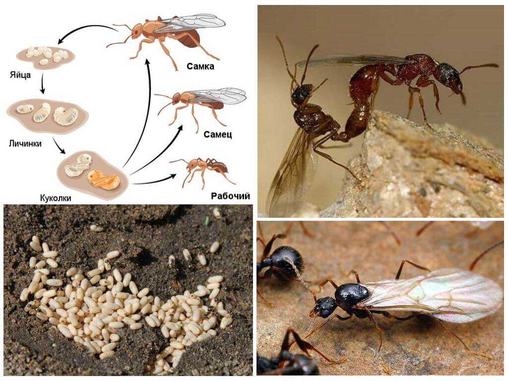 В муравьиной колонии чаще всего присутствует одна репродуктивная самка. Она спаривается только один раз во время «брачного полета». Полученного запаса спермы ей хватает на всю жизнь, продолжительность которой варьируется от 12 до 20 лет и зависит от вида насекомого. Оплодотворенные особи отгрызают себе крылья и создают новую семью. Цикл развития муравьев состоит из нескольких стадий – яйцо, личинка, куколка и имаго. Из оплодотворенной яйцеклетки на свет появляются самки, в противном случае – самцы.