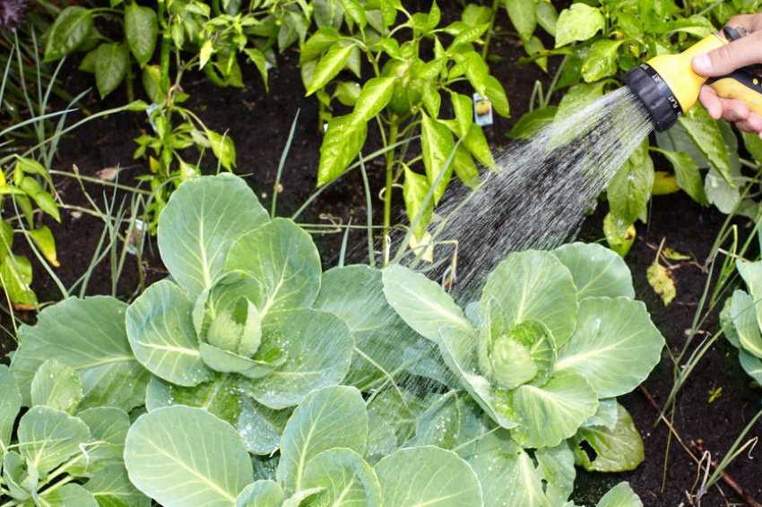 - Полив. В первое время после посадки капуста особенно нуждается в дополнительной влаге, поэтому процедуру проводят каждые 2-3 дня – около 8 л воды на 1 м². По истечении 2 недель частоту поливов сокращают до 1 раза в неделю, а объем при этом увеличивают до 13-15 л на 1 м². Капусту поливают теплой водой. Особенно внимательно следят за соблюдением водного режима в период формирования кочанов.