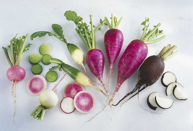- Маргеланская. Иначе ее именуют китайской или лобо. Бывает однолетней и двулетней, цвет и форма сортов разные. Вкус выраженный, почти без остроты. Полезна для пищеварения – выводит шлаки и нормализует работу ЖКТ.