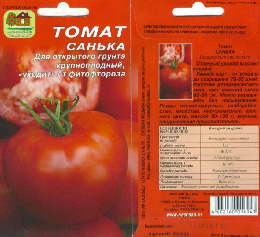 Характеристика и описание сорта имеют схожие свойства со многими ультраскороспелыми видами. Для получения раннего урожая, семена этой культуры сеют в первой декаде апреля в условиях Подмосковья и средней полосы. На Урале, в Сибири сроки посева томатов отодвигают на вторую декаду апреля. Уже через 30-40 дней Санька готов к переселению в открытый грунт или теплицу.
