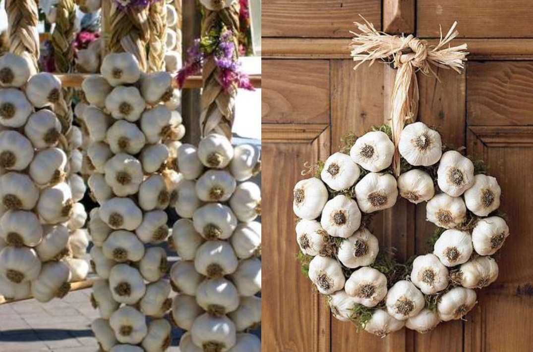 Нестрелкующийся чеснок можно хранить в косах. Для этого чеснок убирают вместе с листьями, просушивают 2–3 суток, а потом плетут косы (рисунок 8), которые затем вешают на гвоздь. Хранить надо в помещениях с хорошей вентиляцией. Чем ниже температура хранения (около 0°) и влажность воздуха (60–65 %), тем дольше сохраняется чеснок. Подвал для хранения не подходит, так как в нем всегда повышенная влажность воздуха. Лучшие условия для хранения в сарае или на чердаках. В случае ожидаемого резкого похолодания воздуха чеснок необходимо укрыть мешковиной, пленкой.