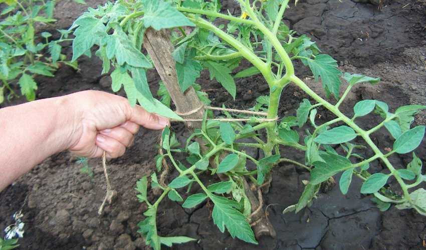 Корни помидоров Краснобай засыпают землей, которую немного уплотняют. Обязательно поливают растения и подвязывают их к опоре.