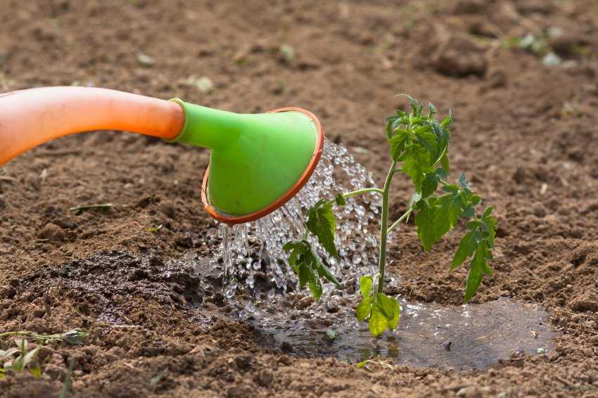В дождливый период поливать томаты не нужно, а при чрезмерном количестве осадков придётся накрыть грядки плёнкой, чтобы избежать застоя воды и гниения растений. Регулярность полива томатов в засушливое лето — 1 раз в 2 дня, причём увлажнение должно выполняться только в утренние часы, с использованием 1,5–2 л воды для одного молодого куста и 4–5 л для взрослого растения. Оптимальным вариантом будет отстоянная и нагретая на солнце вода.