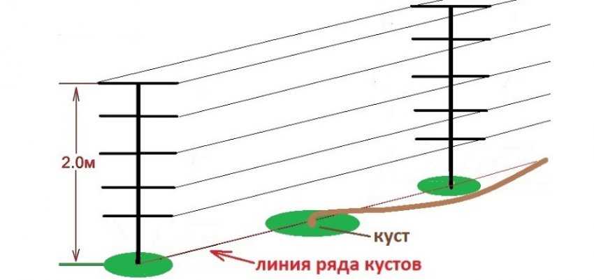 Весеннее. Ранней весной опору с побегами закрепляют горизонтально, что способствует формированию ягод с внешней стороны конструкции.