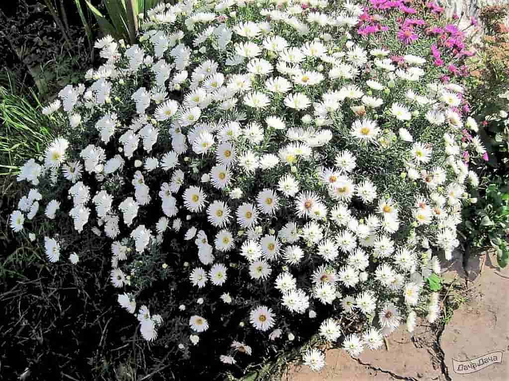 Низкорослые вересковидные астры высотой не более 10 см. Растение формирует густой зеленый «ковер» или «покрывало». Как нетрудно догадаться, цветки белоснежные. Гибрид активно используется в ландшафтном дизайне для оформления рокариев и альпинариев.