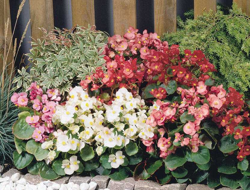 При всей её любви к ярко освещённым участкам почвы цветок себя хорошо чувствует и под деревьями с ажурной кроной. Притом принцип подбора бегонии при её высадке основывается не на сортности, а на сочетании цветов.