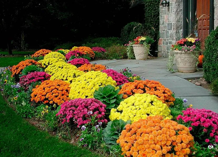 Гибриды распускают лепестки с середины лета и стоят до морозов, что позволяет создать гармоничную композицию из низкорослых сортов хризантем. Эффектно смотрятся декоративные бордюры с бархатистыми бутонами. В центре газона можно разместить сольную группу одного цвета. Красивые многолетники подчеркнут зелень хвойных деревьев.