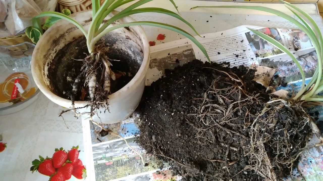 - вместе с комом земли из старого горшка переваливают хлорофитум;