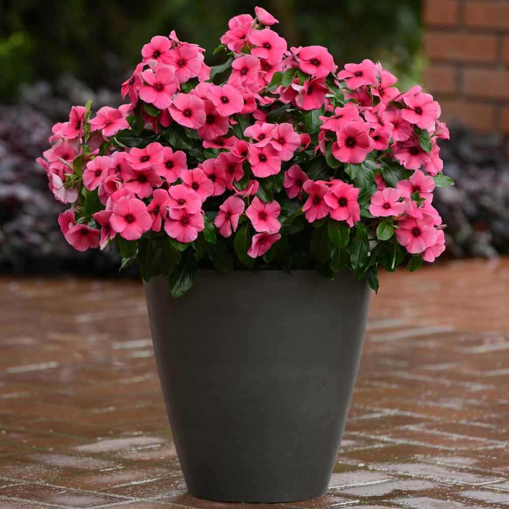Второе название сорта – мадагаскарский барвинок. Катарантус розовый вырастает до 60 см в высоту и ширину. Листва яйцевидная с глянцевым отливом и светлыми прожилками. Окрас лепестков может меняться от светло-розового до красного.
