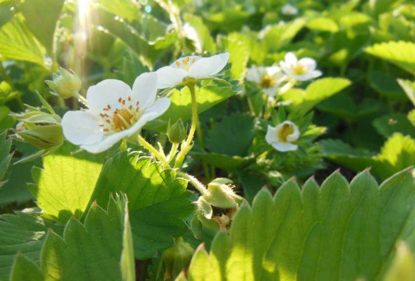 В период цветения почву необходимо удобрять калийными удобрениями, золой. Чтобы увеличить количество во соцветий клубнику опрыскивают раствором борной кислоты. На 1 чайную ложку раствора 10 л воды.