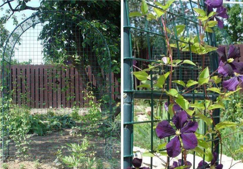 Одним из самых простых, но от этого не менее интересных, способов является создание опоры для клематиса из самой обыкновенной сетки-рабицы. Для ее создания не потребуется ни какого-либо дорогостоящего материала, ни особых усилий, эта опора проста, экономична и вместе с этим эффектна.