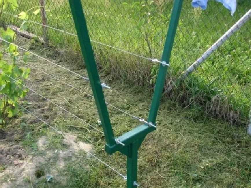 Шпалера представляет собой два столба, между которыми натянута толстая проволока, к которой и крепится лоза. Дать необходимое натяжение позволит использование талрепов. Конструкция должна быть надежной и выдерживать большой вес