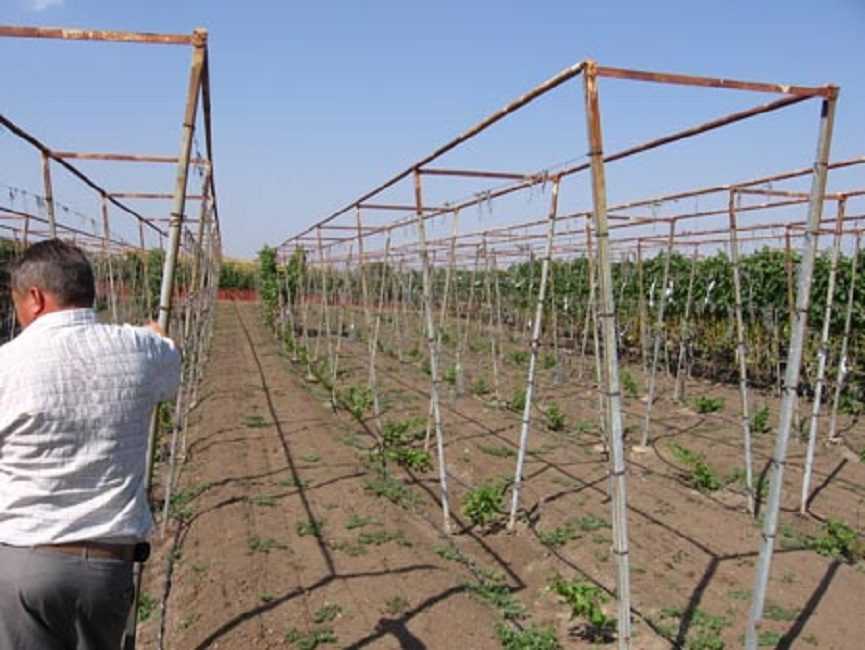 Расстояние между опорами должно быть равно расстоянию между кустами винограда. Обычно это 2,5 — 2,75 м.