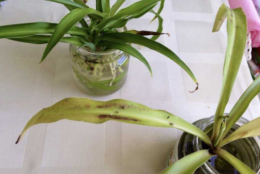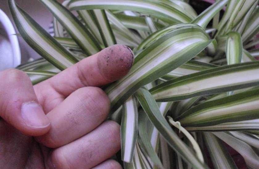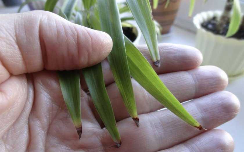 Если лист хлорофитума сохнет только с кончика, то вполне вероятно, что проблема в избытке натрия в грунте. Прекратите подкармливать растение теми удобрениями, в которых содержится натрий, и постепенно растение восстановится. Иногда хлорофитум чернеет и сохнет с конца листа, если грунт в горшке в жаркое время подолгу бывает сухим или влажность воздуха недостаточно высока – проверьте свои подозрения и устраните недостаток в уходе.