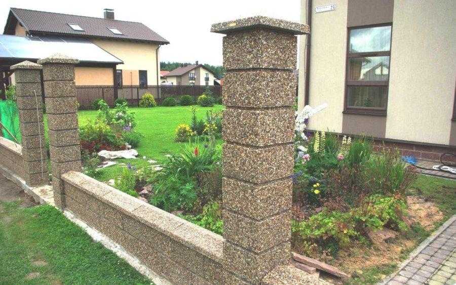 Такое ограждение будет прочным благодаря технике исполнения, поэтому необязательно устанавливать опоры глубже фундамента. Такой метод получается дорогостоящим, но конструкция простоит века.