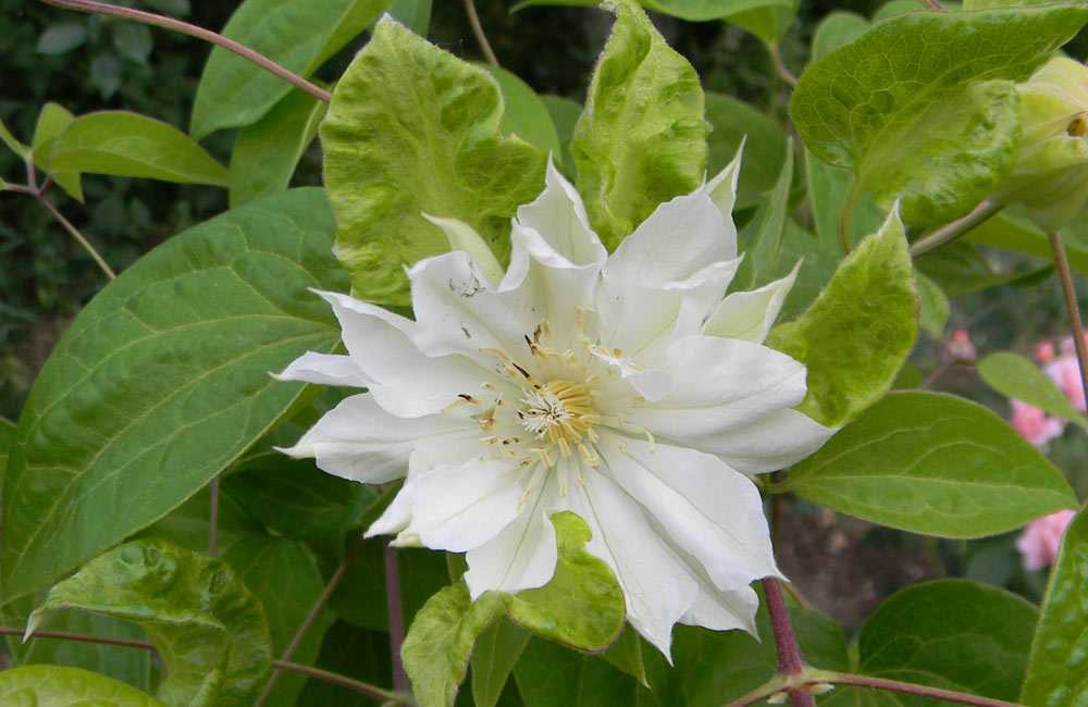 Мария – лиана, имеющая белые махровые шаровидные цветки. Диаметр некоторых цветков достигает иногда до 15 см. В прохладную погоду цветки становятся зеленоватыми. Цветет с июня по июль включительно. За этот период лиана вытягивается до 2 м. Обожает солнечные, продуваемые места.