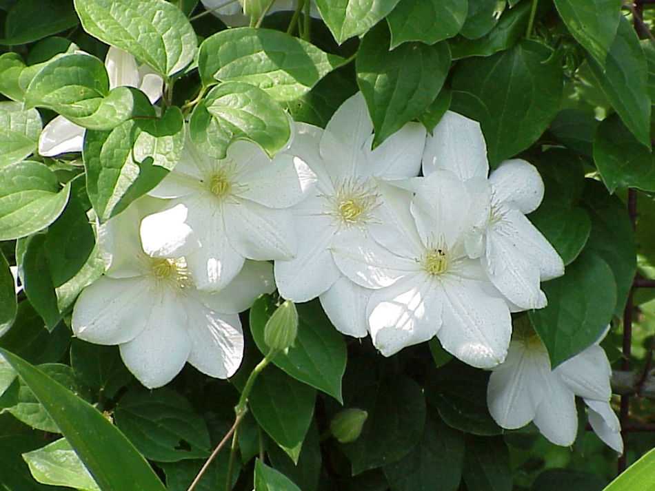 Мадам ван Гутт. Лиана до 3–3,5 м длины. Цветки белые, в начале цветения с едва заметной голубизной, 15– 18 см в диаметре. Цветет в июне и повторно в августе – сентябре.