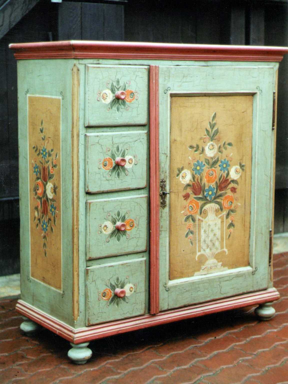 Состаривание. Мебель из натуральной древесины можно «состарить». Эффект потертости под старину поверхности шкафа достигается следующим образом: светлый тон дерева красят в любой темный оттенок в зависимости от цветовой палитры комнаты. Затем после полного высыхания краски необходимо натереть свечой несколько фрагментов, после чего наносят светлую краску, например, беж, белую, кремовую. Когда после второй покрашенный слой протирается наждачной бумагой, через некоторые светлые места будут видны потертости. которые темнее. Когда декорируется темный шкаф, делают кракелюры. Для этого на поверхность наносят кракелюрный лак. После его высыхания образуются мелкие трещинки, которые выделяются при помощи сухого пигмента или масляной краски желаемого оттенка.