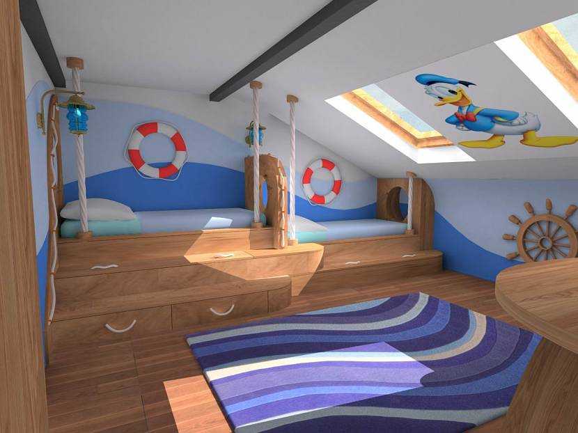 Вариант детской комнаты на чердаке в мультяшно-морском стилеИсточник legkovmeste.ru