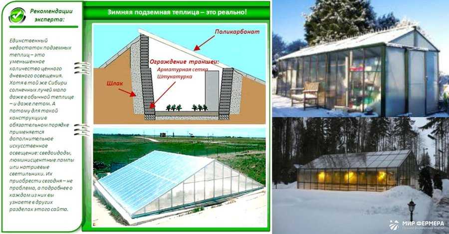Зимний вариант отличается от весенне-летнего не только наличием отопления и освещения, но и материалами, из которых изготавливается сооружение. Конструкция должна быть надёжной и износостойкой. Она устанавливается на прочный фундамент. Поликарбонат выбирается утолщённый, чтобы лучше сохранять условия, созданные внутри. Для каркаса используются прочные материалы, мало подверженные воздействию температурных перепадов и влаги.