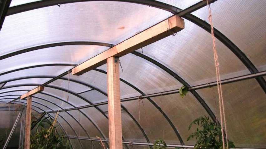 Самым распространенным способом усиления и создания прочной теплицы из поликарбоната является установка подпорок. Они изготавливаются из бруса, досок и другого прочного материала.