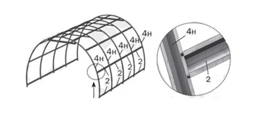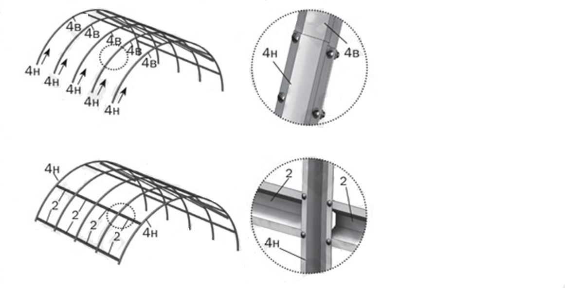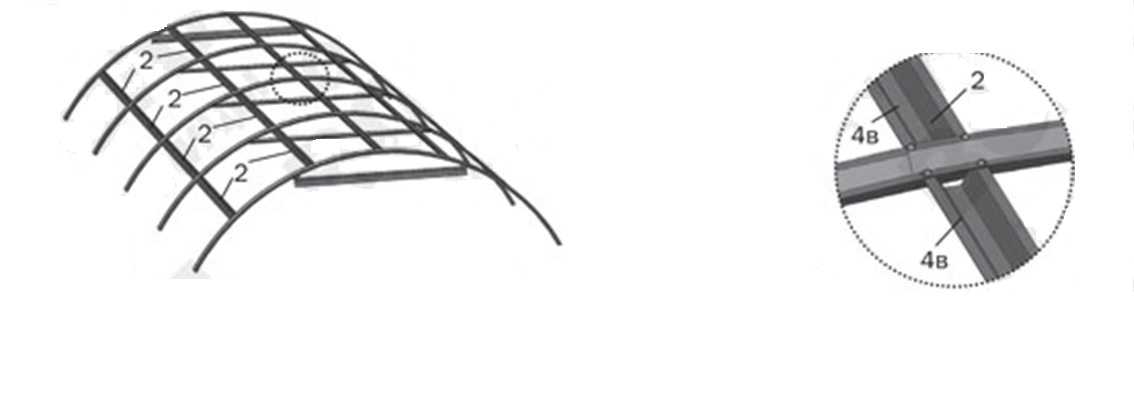 Шаг 3. Затем с одной из сторон частично собранного каркаса прикрепляйте дуги нижние (4н) к дугам верхним (4в), а к ним затем – прогоны (2).