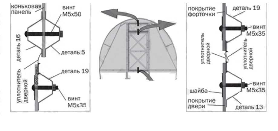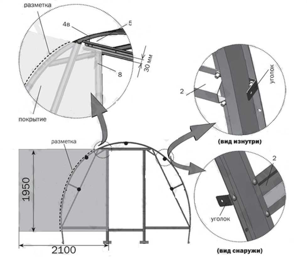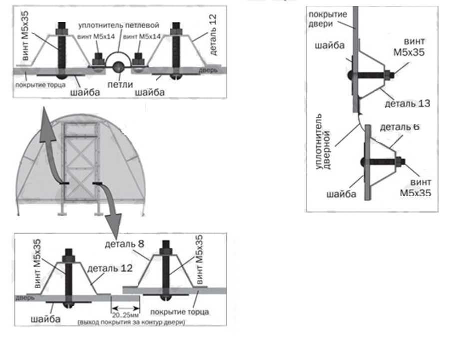 Шаг 13. Боковые части торца установите, как на рисунке. Закрепите покрытие винтами с шайбами, придерживая его, по деталям: торцевой нижней стяжке (6к), по кромке стоек дверного проема, верхней и нижней (7 и 8), а также и по уголкам. Подровняйте материал по дугам и прикрепите профиль-уплотнитель.