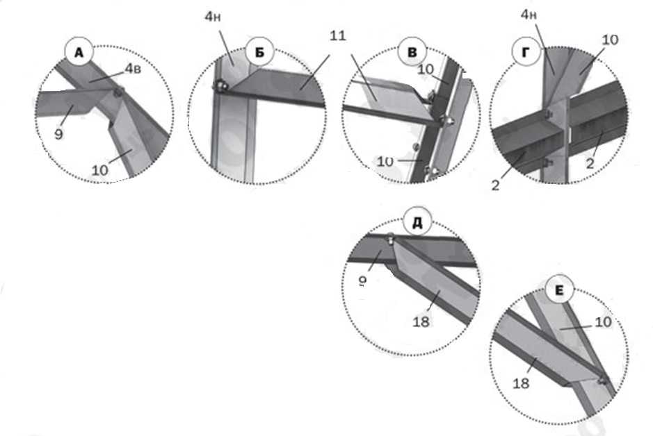 Шаг 8. Теперь внутри частично собранного каркаса на каждой несущей дуге установите боковые подкосы (10), которые получаются путем сбора из двух одинаковых частей. Распорку подкоса бокового (деталь 11) устанавливайте одним краем на стыке боковых подкосов (10), а другим концом – на несущую дугу. Укосами жесткости (18) соедините стяжки с боковыми подкосами.