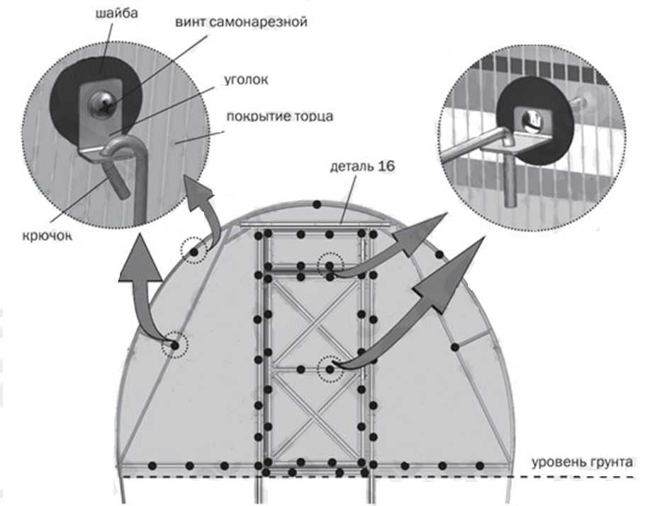 Крепление деталей для установки теплицы в грунт