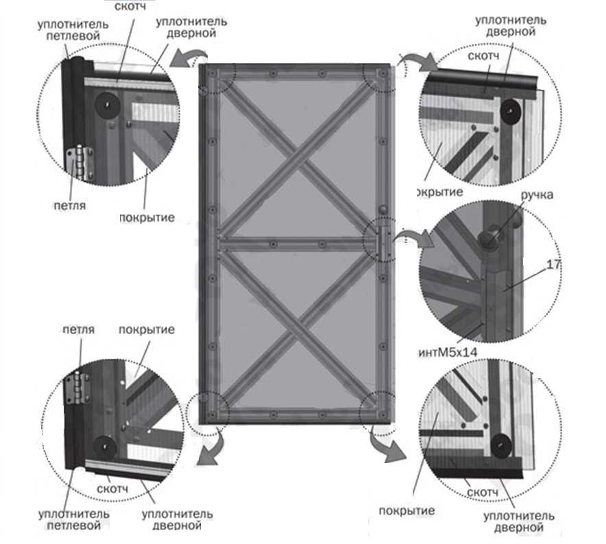 Шаг 14. Укрепите поликарбонат при помощи шайб на форточке и двери, по одной стороне сделав припуск. Установите по контуру дверей уплотнительный профиль. Петли устанавливайте поверх поликарбоната.